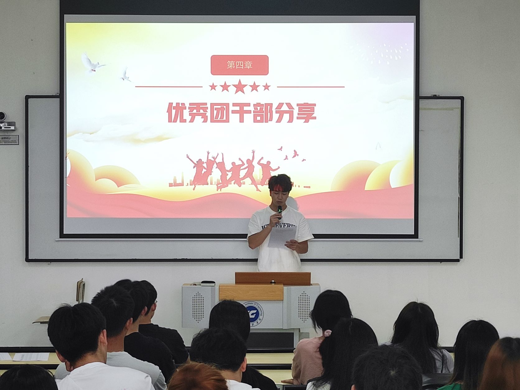 活动伊始,由同学们齐唱《光荣啊,中国共青团》拉开活动序幕,主持人沈鸿英通过“视频+讲解”的形式带领同学们学习习近平在庆祝中国共青团成立一百周年大会上的重要讲话精神,让大家进一步认识到党和国家始终把关注的目光投向青年,始终把革命的希望寄予青年,进步一步认识到当代青年要在实现民族复兴的赛道上奋勇争先;最后由优秀团干部张垚同学分享学习感悟,展现青年的热情活力。