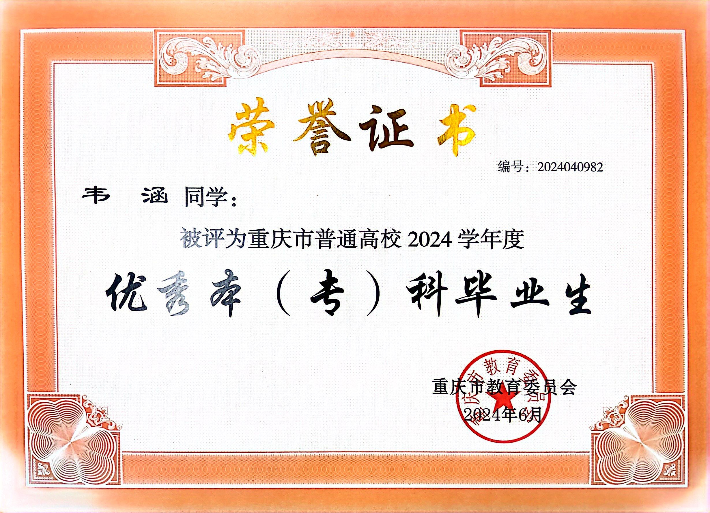 认真走过的每一步都留有足迹,大学期间,她取得了可喜的成绩,校内连续获得国家励志奖学金、校级优秀奖学金,还获得了重庆市“优秀毕业生”、重庆市“优秀学生干部”等荣誉称号。在实践中历练,在担当中成长,韦涵在重工校园里尽情追逐梦想之光。
