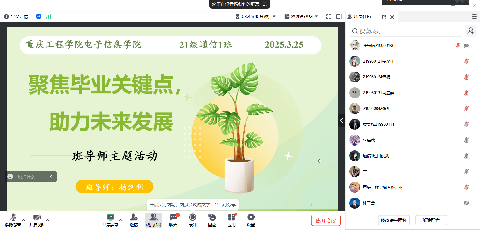 为助力21通信1班同学顺利毕业、成功就业,班导师杨剑利于2025年3月25日通过腾讯会议召开“聚焦毕业关键点,助力未来发展”主题班导师活动。聚焦就业、毕业实习、毕业条件等关键议题,为同学们的未来发展指明方向。