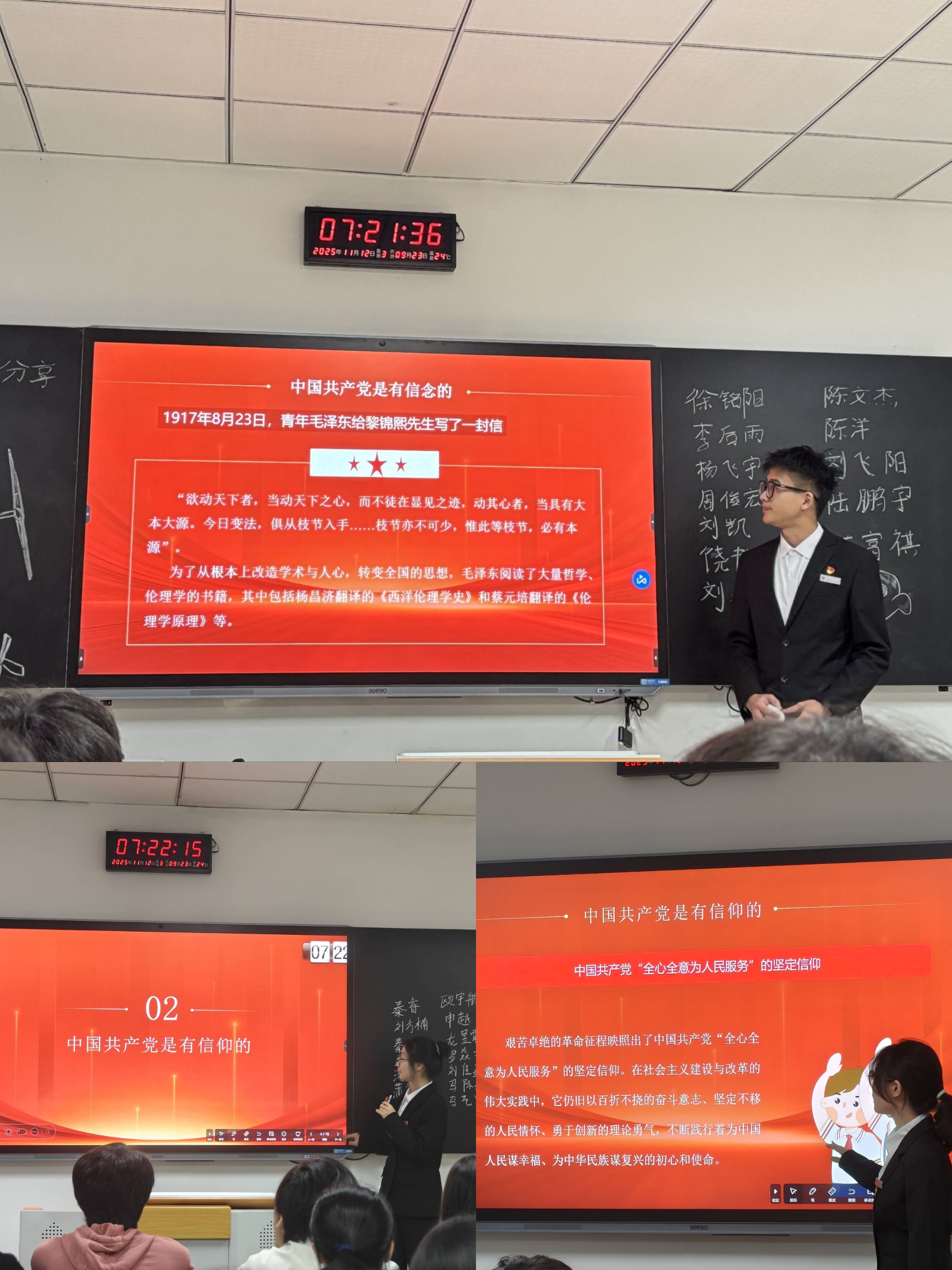 宣讲中,党员学长学姐围绕“信念、信仰、信心”三大核心维度,结合自身成长与实践经历分享感悟。他们以党的百年奋斗历程为脉络,讲述革命先辈在艰难险阻中坚守文化立场的故事,阐释共产党人“为中国人民谋幸福、为中华民族谋复兴”的初心信念;学长学姐结合专业学习经历,提到在学科竞赛、志愿服务中,始终以马克思主义信仰为指引,弘扬革命文化中践行青年担当。