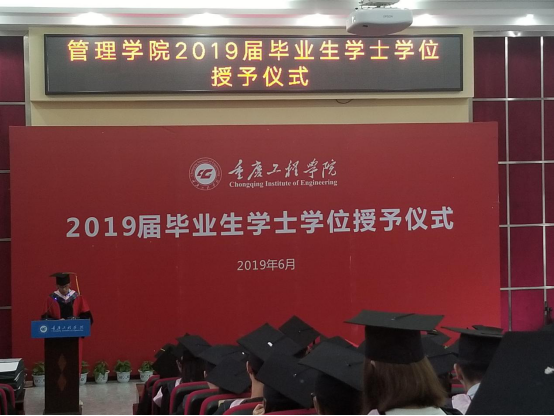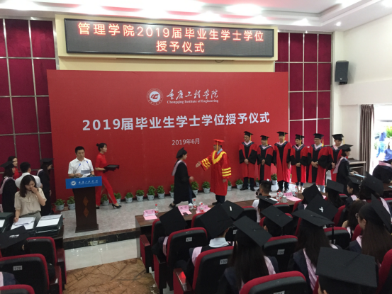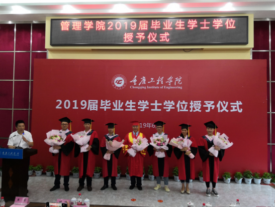 仪式上,管理学院执行院长简玉刚宣读重庆工程学院学位评定委员会授位决定。院长李琪教授为学院2019届本科毕业生授位并与授位同学合影。