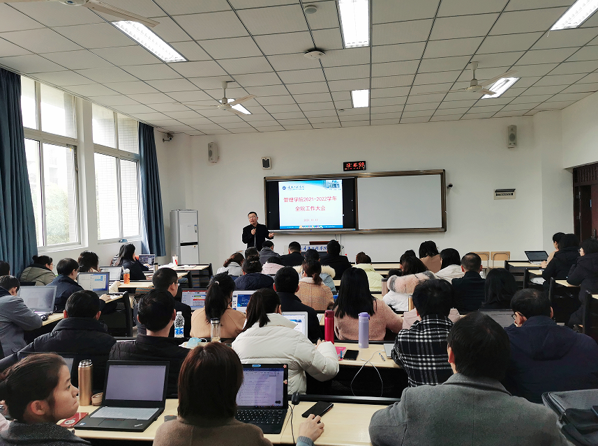 2021年11月17日,6107教室,管理学院召开2021-2022学年第3次全院工作大会,学院全体教职工参加了此次会议。