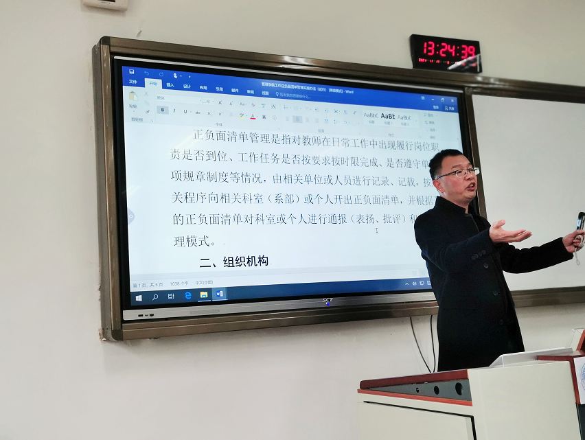 彭建仿院长宣讲学院新出台的两项制度文件。一是《管理学院工作正负面清单管理实施办法(试行)》。为进一步提高学院各项工作完成质量,提升工作执行效率,实现队伍管理的规范化、制度化、常态化,学院特制定并计划执行本办法。学院成立正负面清单管理领导小组。领导小组下设办公室,办公室设在学院综合办,全面负责正负面清单管理日常工作,并接受全体教职工的监督。每学年、自然年度,根据每(学)年的履职情况开展全员述职评议,由学院领导根据述职情况和平时掌握的工作情况对述职人进行评议。述职评议结果和清单管理结果,作为干部选拔任用、教职工(学)年度考核、教职工评先选优、教职工年度目标绩效奖金等次的重要依据。正负面清单在全院范围内进行书面通报。正面清单实行通报表扬制,负面清单实行积分制。二是《管理学院Z积分经费分配办法》。为充分调动学院全体专任教师的工作积极性与主动性,提高学院专业建设、课程建设、教研教改等方面的水平,提升学院教育教学质量,根据学校Z积分管理办法的要求,结合学院的实际情况,特制订本办法。本办法采取过程考核与结果考核有机结合原则;70/20/10原则(经费总额的70%用于系部教学建设工作,20%用于教学管理工作,10%用于教学竞赛专项工作)。上述两项制度办法,即日起开始执行。