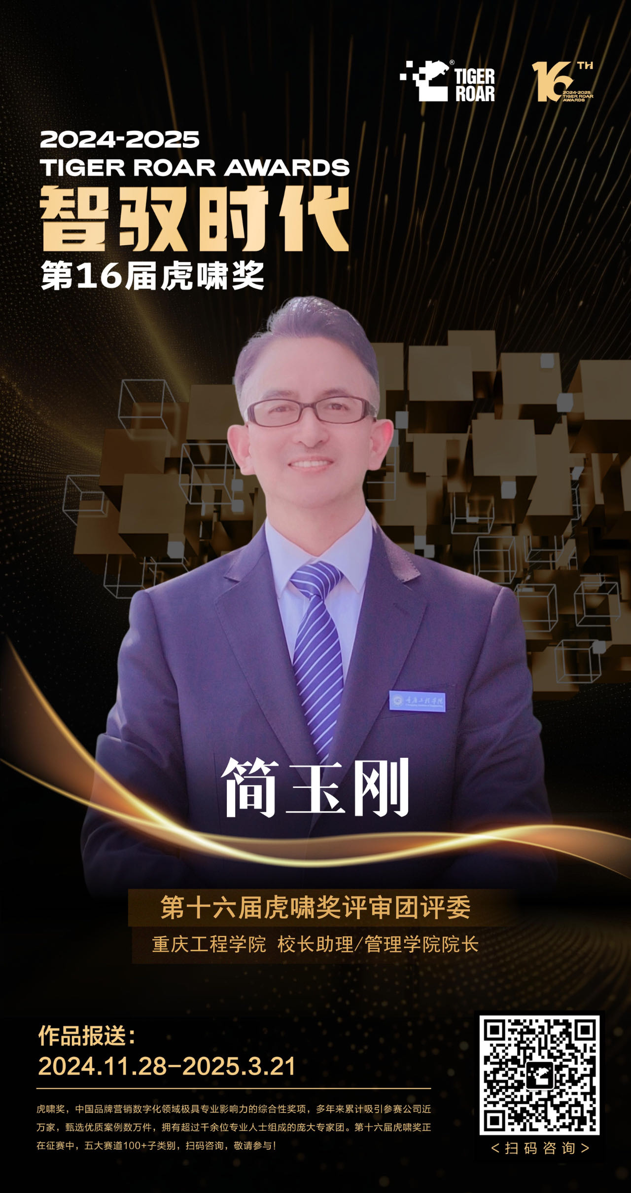 (文/图 办公室 朱露)全国第十六届虎啸奖评审工作于近日正式启动,管理学院简玉刚院长因学校在数字营销人才培养方面的社会影响力受邀担任评审团评委。虎啸奖是中国品牌营销数字化领域具有专业影响力的综合性奖项,由中国商务广告协会指导。自2009年创办以来,已成功举办15届,累计吸引参赛企业近万家,评选出优质案例作品数万余件。第十六届虎啸奖以"智驭时代"为主题,聚焦智能化技术快速发展背景下的数字营销行业转型升级,探讨新技术、新思维在营销领域的创新应用。