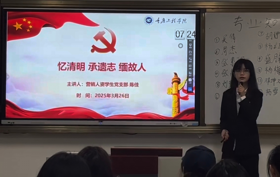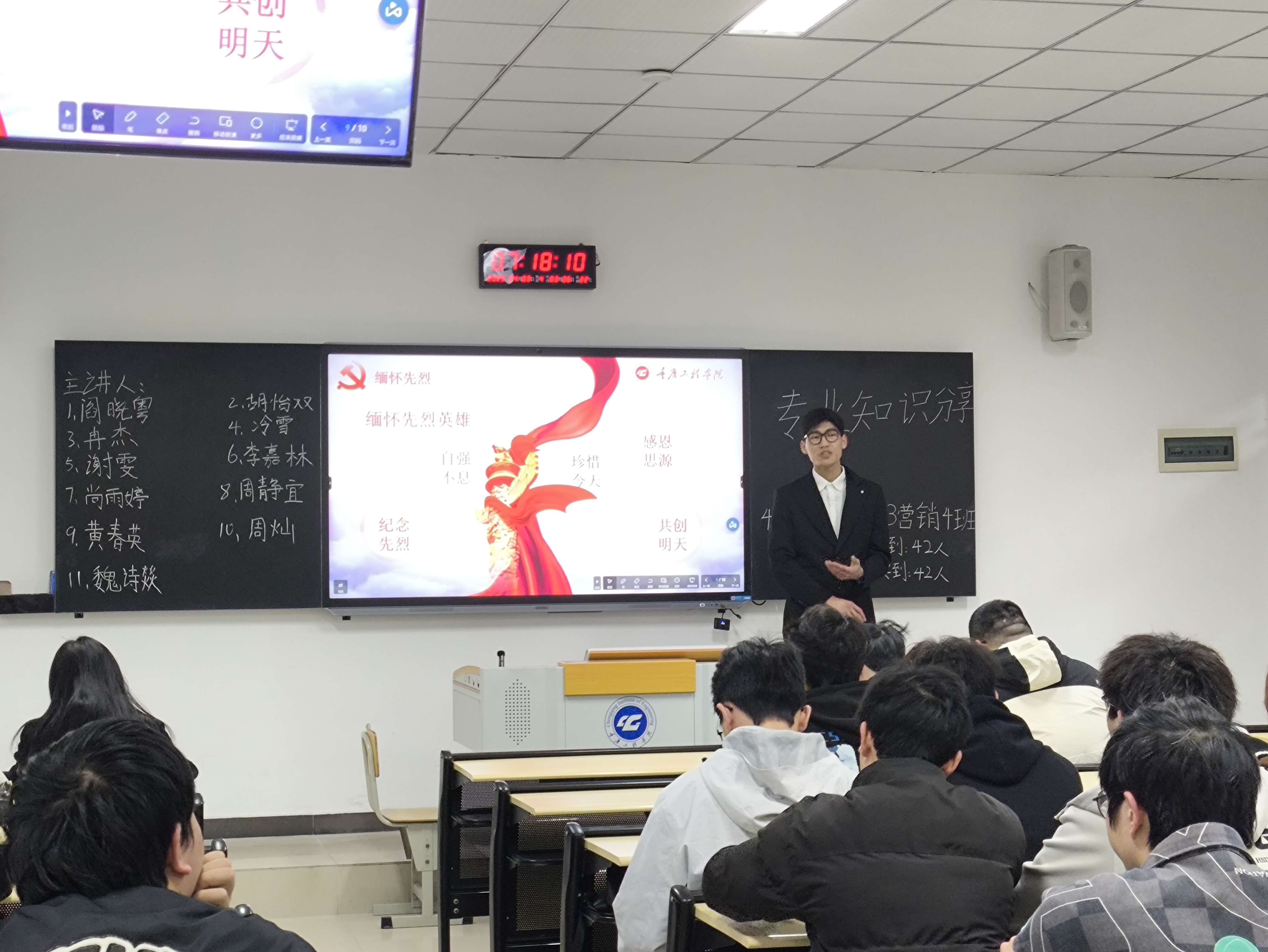 (文/白丹 图/黄媛媛 学生党教中心)为缅怀革命先烈,传承红色基因,结合学院七培四创大学生理想信念教育方案,将党史学习教育融入日常,管理学院学生党员实践教育分中心于2025年4月3日在第六教学楼组织开展了“大学生微党课”进班级活动。本次活动由七名优秀的学生预备党员走进2023各班级,为同学们带来一场主题为“忆清明,承遗志,缅故人”的精神洗礼。