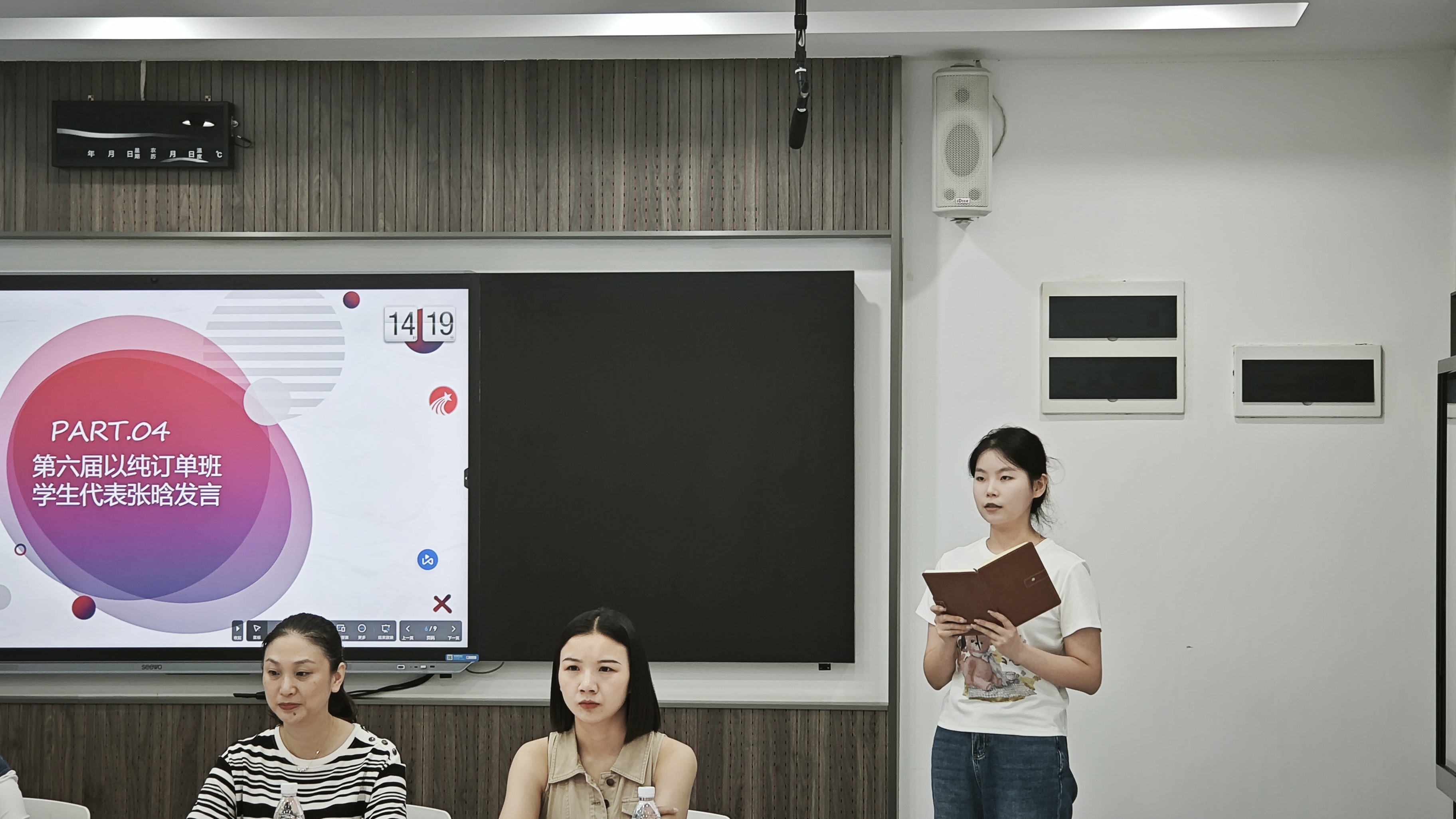 第六届以纯服饰订单班学生代表张晗发言,张晗代表同学们感谢学校和企业为大家搭建和提供的以纯订单班这一平台,同学们一定会加倍珍惜这一难得的机会,以最饱满的热情和实际行动,用所学所能回报学校,回报企业。