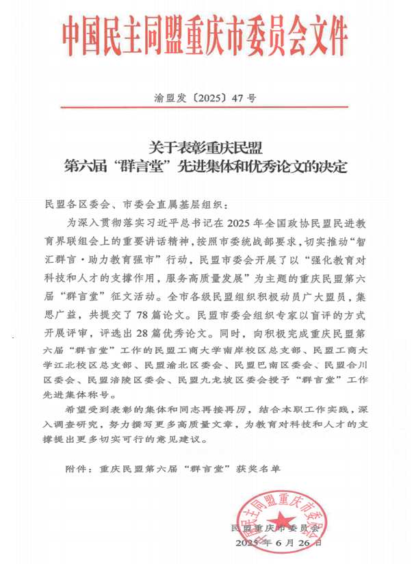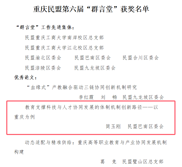 (文/ 办公室 朱露)近日,民盟市委会开展了重庆民盟第六届“群言堂”征文活动,旨在汇聚专家学者的智慧,围绕经济社会发展中的热点难点问题建言献策。巴南区政协委员、民盟盟员、管理学院院长简玉刚提交的论文《教育支撑科技与人才协同发展的体制机制创新路径——以重庆为例》被评为优秀论文。