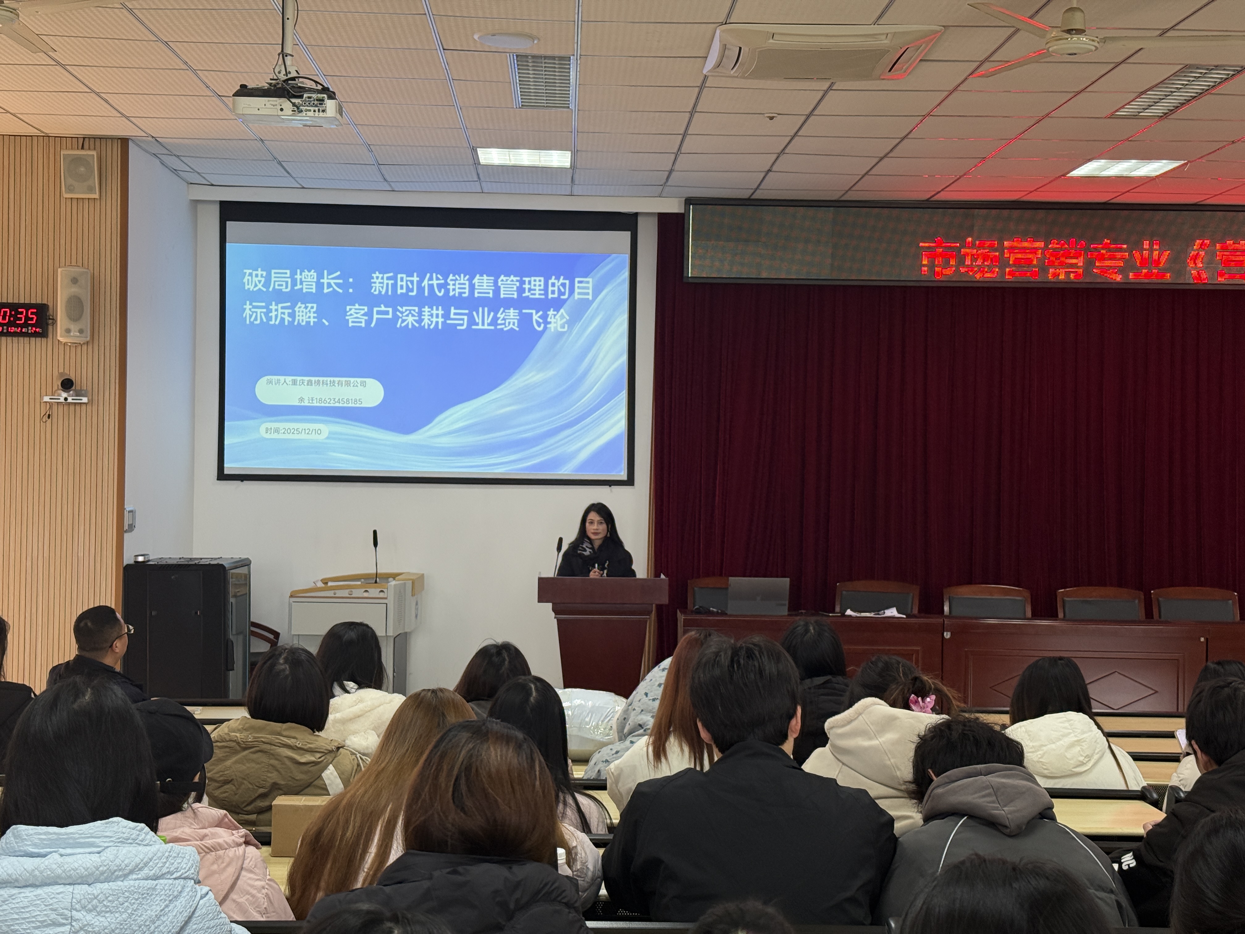 本网讯(文/图 王渝)2025年12月10日下午,我院在6302报告厅举办了市场营销专业《销售管理》一课双师专题讲座。本次讲座特邀重庆鑫榜科技有限公司总经理余迁担任主讲人,市场营销专业2023级全体学生参加。数字营销系教师、《销售管理》课程负责人王渝博士出席并致欢迎辞。
