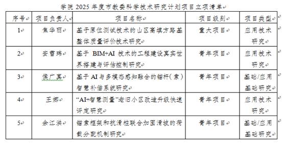 本网讯(文/图 王强) 近日,重庆市教育委员会正式下达通知,公布了2025年度市教委科学技术研究计划项目立项名单,建筑工程学院焦华丽老师负责的项目获批重大项目、安雪玮等4位老师负责的项目分别获批青年项目。