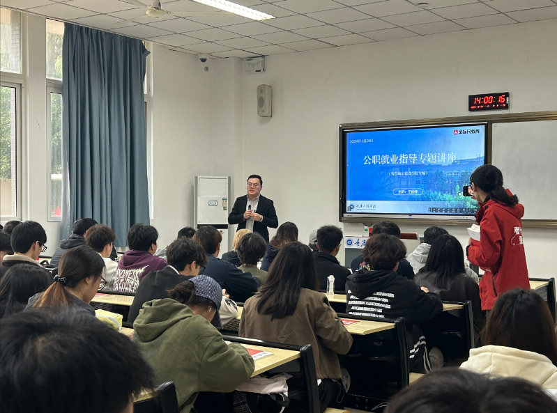 本网讯(文/图 胡璐玺) 10月29日下午,智慧城市建设学院在南泉校区第六教学楼6101成功举办了以“公考指导”为专题的讲座。活动特邀金标尺教育的王俊峰老师,为同学们带来了一场收获满满的指导会。