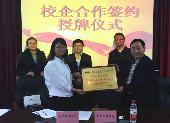 2017年3月29日下午,我校与重庆哈渝机器人有限公司在行政楼第二会议室举行校企合作签约暨授牌仪式,永川工业园区凤凰湖管委会科长赵昌全、哈渝公司副总经理贾万玲、我校党委书记兼常务副校长张业平、智能与自动化学院院长曹耀钦、校企合作办主任秦凤梅出席了签约仪式。