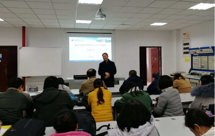 本网讯(文/图 罗桓)2019年1月17日中午,计算机学院在实训楼101教室召开专题会议,学习教育部《新时代高校教师职业行为十项准则》,进一步加强与推进我院师德师风建设。学院全体教职员工参会,会议由曹耀钦院长主持。
