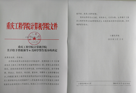 在学校对各学生宿舍进行专项检查中,发现和园4号316宿舍违反《重庆工程学院学生住宿管理规定》第二章第九条的相关规定,违规存放或使用大功率电器。经学院研究决定,给予曾维旗、陈金山、张家杰、朱垚燊、董浩林、邹颗等6名同学警告处分,并根据《重庆工程学院国家奖助学金评定及管理实施办法》《重庆工程学院学生先进集体和个人评选表彰办法》《中共重庆工程学院委员会发展党员工作细则》,取消以上6名同学本年度的评奖评优评助、发展入党等资格。