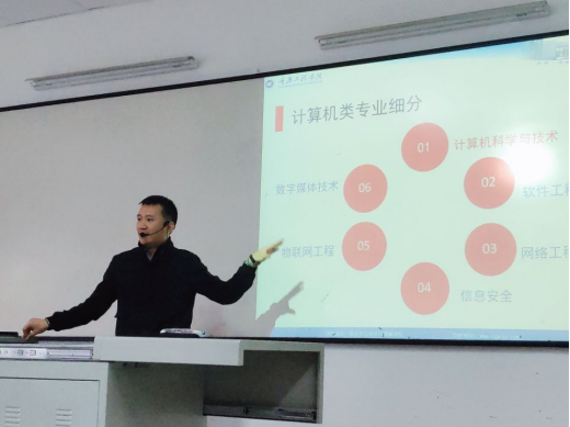韩坤老师从计算机类相关专业划分、计科专业培养目标、计科专业学生应具备的能力素质、计科专业开设的主干课程和计科专业优势等几个方面向同学们进行了专业介绍,回答了同学们提出的一些专业问题,有的同学对计科专业感到迷茫,专业发展方向不明确,韩老师对同学们提出的问题和感到的一些困惑一一作了解答,消除了同学们的疑虑。最后,韩老师对同学们提出了期望,希望同学们珍惜大一宝贵而短暂的时光,勤奋学习,为后续的专业学习打下一个坚实的基础。