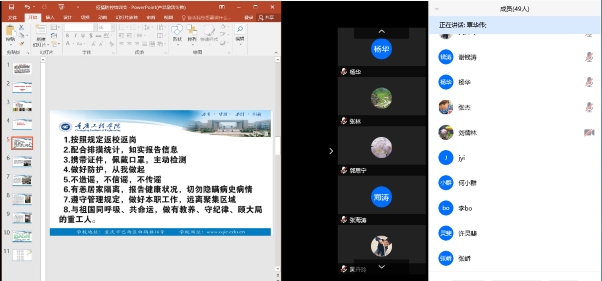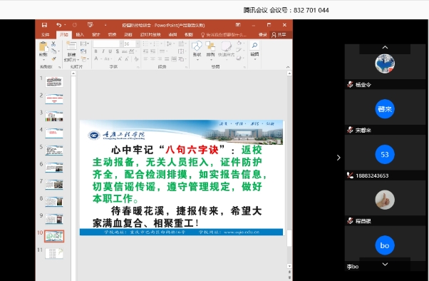 覃书记指出虽然国内疫情防控形势持续向好,生产生活秩序加快恢复,但越是这个时候越不能有麻痹思想、侥幸心理和厌战情绪,仍需要严格按照学校的要求做好自我和学生的防护。他强调:全院师生一定要按照重庆市教委和学校的规定返岗返校,做好自我防护,遵守管理规定,做好本职工作,做与祖国同呼吸、共命运、有教养、守纪律、顾大局的重工人!