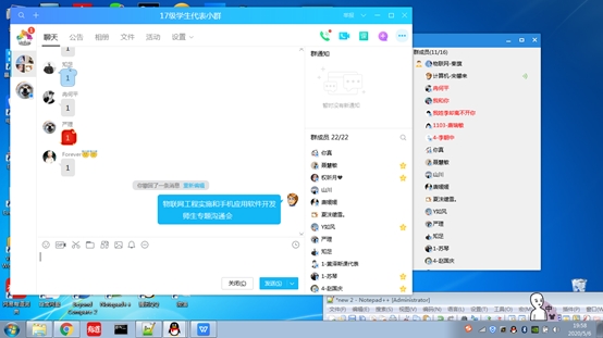本网讯(文/图 秦旗)为更加全面的了解教师线上教学基本情况,广泛听取学生对线上教学的意见和建议,落实以教师为主导学生为中心的教学理念。2020年5月6日晚8时,《物联网工程实施》与《手机应用软件开发》课程共同召开了线上教学学生视频座谈会。宋馨来老师、秦旗老师、17级各班班长、团支部书记、学习委员与课代表参加了会议,会议由宋馨来老师主持。