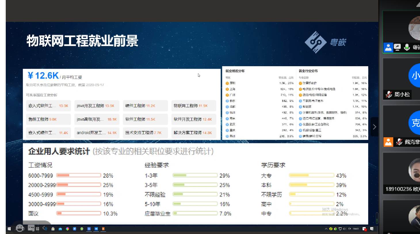 本网讯(文/图 周小松 魏克非) 2020年9月21日19时、22日19时,我院依托腾讯会议在线组织了两场针对不同专业的“行业职业规划”就业讲座。此次讲座由广州粤嵌通讯科技有限公司技术总监刘意高工主讲,我院就业科魏克非科长主持会议,2018级物联网工程、网络工程、计算机科学与技术的全体同学通过网络参加了此次讲座。