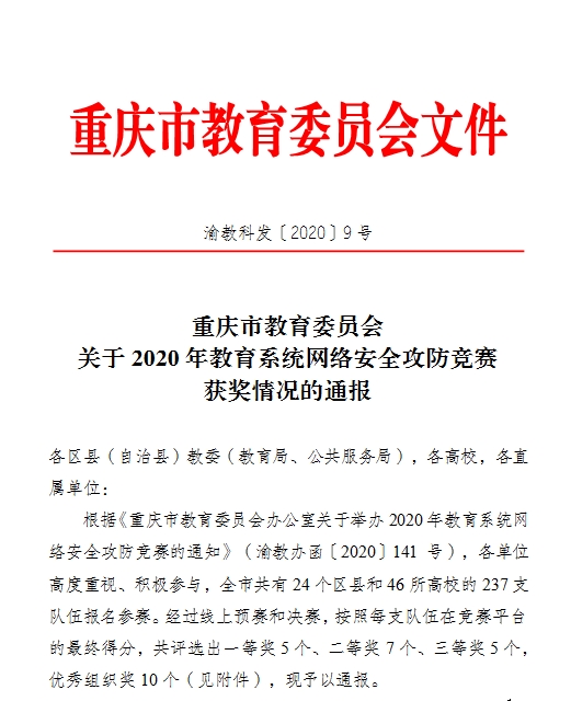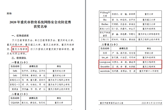本网讯(文/图 官节福)由重庆市教委举办的2020年教育系统网络安全攻防竞赛决赛结果出炉,经初赛角逐筛选,我校计算机与物联网学院网络安全协会学生向贵龙、单毅、秦继伟组成的“LoongLove”团队,王娟、李雪、朱宗毅组成的“SnowWin”团队入围决赛并双双获得三等奖,我校荣获优秀组织奖。这也是我校自本赛事开赛以来的首次入围和获奖。