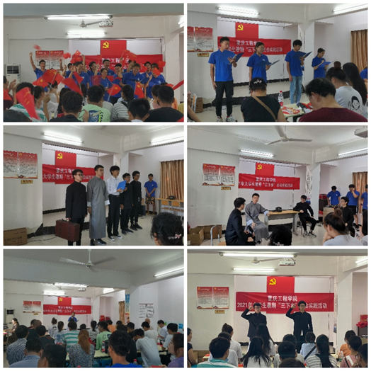 2021年7月22日9:00,宣讲团正式开始宣讲,并通过多种形式进行宣讲。首先由宣讲人龚香琳提出新时代的形象象征是什么的问题后,交代了1919年至1954年1月的中国历史背景以及五四运动发生的原因,展现了在五四运动时期的新青年热血、朝气和希望。深刻表达中国人民面对民族危亡绝不低头的精神。然后通过表演觉醒时代的片段来体现中国人民不屈不挠的意志,中国人民绝不退缩的脚步。即使手脚戴着镣铐也不能熄灭中国人民抗战到底的决心。其次,宣讲团齐唱《国家》,歌声嘹亮,表达国与家的关系,国家是荣耀的毅力,家是幸福的洋溢。宣讲团四人激情饱满地朗诵诗歌,弘扬五四精神,呼吁各位积极了解五四运动,了解五四精神。最后,宣讲人张鑫在宣讲的过程中,述说中国从1840年至1919年期间中华民族在血与泪中获得社会主义的曙光。在1919年至1921年期间中国找到属于自己的新思想、新精神,从此马克思主义在中国扎根,中国也将迎来璀璨未来。最后,宣讲团对在场的群众和党性分子进行采访提问。被采访者也一一回复个人关于党的认识和看法。