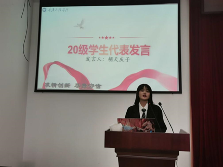 然后,由学生代表胡天庆子发言。以大一的时光引出现在大二的生活,激发对于学习的思考,为了什么而学习。围绕学习,探讨出是为了建设强大的国家,在发言的最后号召全体同学为中华民族的伟大复兴而努力奋斗。