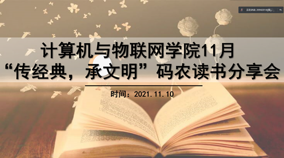 本网讯(文/图 张涛)为引导学生养成读书分享的良好习惯,2021年11月10日14:00计算机与物联网学院在腾讯会议开展“传经典,承文明”码农读书分享会。计算机与物联网学院12名同学参加本次活动。