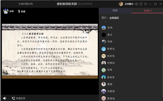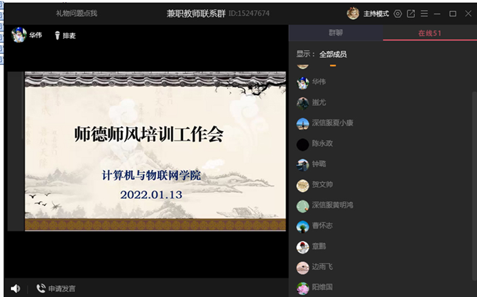 本网讯(文/图 罗桓)2022年1月13日下午,学院通过在线QQ课堂召开了外聘教师师德师风培训会,会议由党总支书记覃华伟主持。