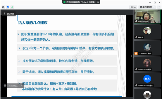 此次线上就业指导讲座的成功开展,有助于引导我院大一学生树立正确职业观,更好地进行自身职业生涯规划,提升自身的职业素养,增强就业竞争力,为今后的进一步发展打下坚实的基础。