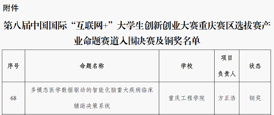 第八届中国国际“互联网+”大学生创新创业大赛产业命题赛道重庆赛区比赛成绩公布,我院学生的“多模态医学数据驱动的智能化脑重大疾病临床辅助决策系统”项目获得重庆赛区铜奖。项目负责人:方正浩。团队学生:王楠、阳绪铃、陈磊、杨红梅、陈林、方正洪(外校)。指导教师:朱世宇、黄胜、孙令翠、王慧英、杨成莉。