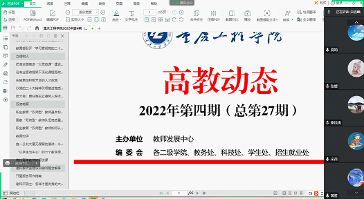 2022年12月12日下午,物联网工程系全体教师线上进行《高教动态》2022年第4期学习。本次重点学习了“ 以学生为中心 ”“施一公北大毫无保留的演讲:永远不要做一个与社会格格不入的人”相关内容,通过本次学习了解了最新的教育信息,老师们对师德师风、教学思路、金课建设进行了探讨,对“谢和平院士:怎样才是优秀的大学老师进行认真学习”,热烈讨论如何成为一个优秀的老师。通过本次学习让老师们了解到高校教师的最新理论和最新的理论成果,老师们都对文件进行了认真学习,并将相关资料转发到系部群,方便老师们后期研读,让教师们能够得到很好的借鉴和升华。
