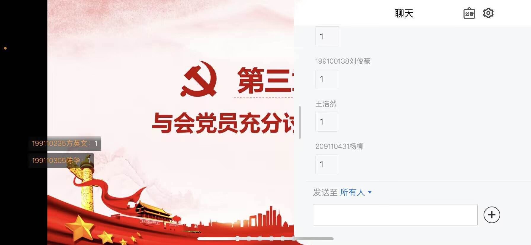 本次大会按照规定程序进行。会上,7位发展对象逐个汇报了自己对党的认识和入党动机,总结了在思想上、生活上、学习上及工作上的进步,认真学习,专心科研,积极参加各项活动,同时也指出了自己存在的不足之处。接着由入党培养人具体介绍了每位同志的培养考察情况,并对其能否入党表明意见。随后,各位党员也对以上同志入学以来的表现进行了评议与投票,7位发展对象全票通过吸收为预备党员,并进行入党宣誓。
