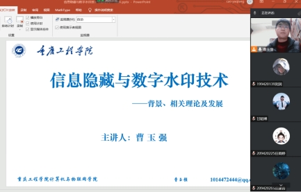 2022年12月28日,重庆工程学院计算机与物联网学院曹玉强老师通过腾讯会议在全员学生中开展信息隐藏与数字水印背景、相关理论及发展为主题的学术讲座。本讲座是学院“星耀讲坛”本月的第三讲,共有140名学生参加。