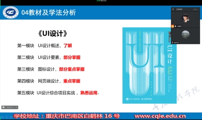首先,强调了本次说课的主要目的:提高课程组的课堂教学质量,加强课程组各个老师之间的互相交流,明确《UI设计基础》课程的教学方式。其次课程组长进行说课,从“说教材、说学情、说目标、说教法(课程思政)、说学法、说教学(过程)”。方面对《UI设计基础》课程进行分析及展示。最后,严天华老师对本次说课进行评价,对《UI设计基础》课程的教材、学情等方面做了明确说明,通过讨论,鼓励大家需要继续努力学习其他优秀“说课”案例。