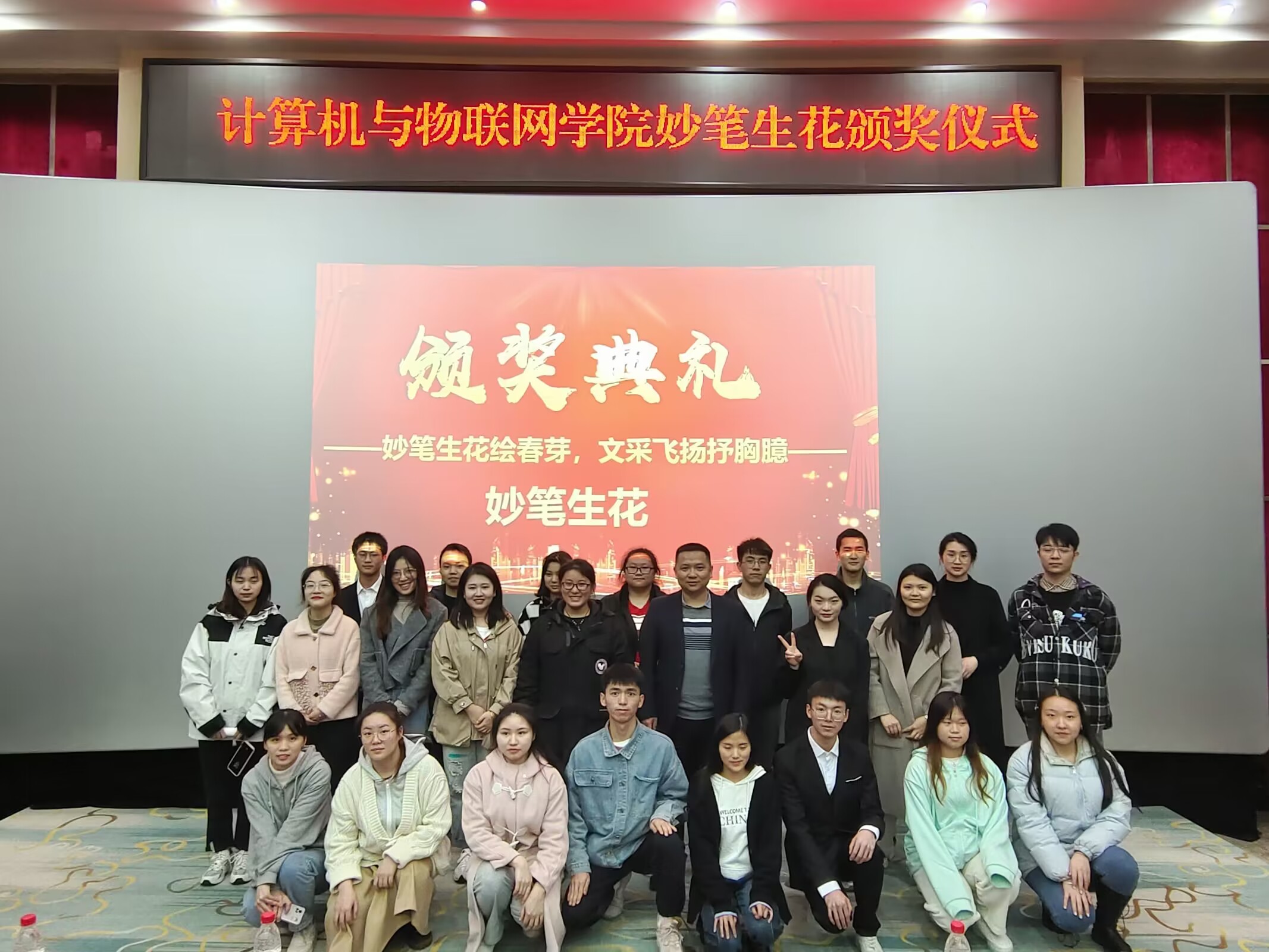 本网讯(文/黄兰茜 图/马春艳)为鼓励在“妙笔生花”活动中投稿作品优秀的同学,并增强同学们投稿的积极性,计算机与物联网学院于2023年3月29日下午,在阶梯报告厅顺利举行“妙笔生花”颁奖典礼,出席本次颁奖典礼的嘉宾有计算机与物联网学院党总支书记覃华伟、分团委书记郝恬、分团委副书记张运、辅导员李心怡、杨颖、王玲以及200余名学生代表。