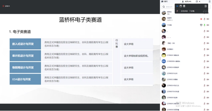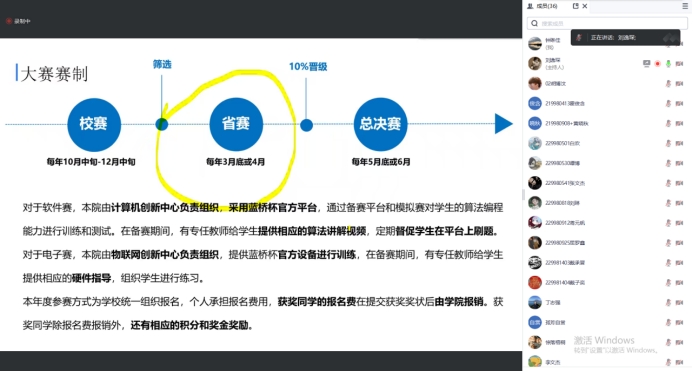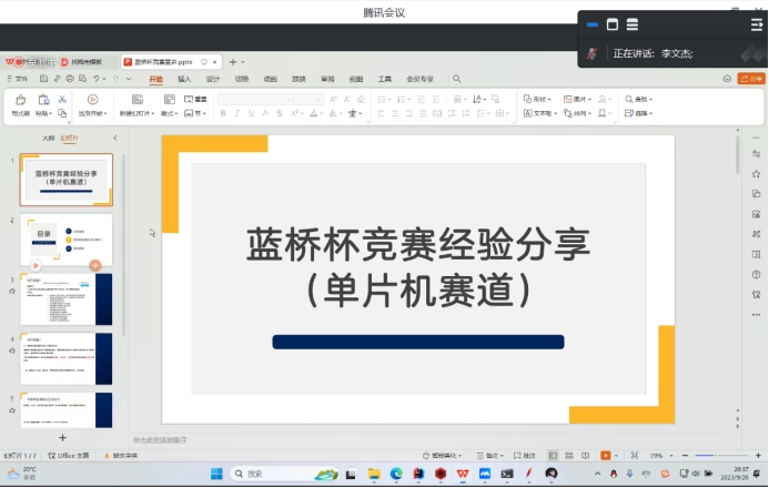 本次会议由计创中心刘逸琛老师主持,刘老师首先介绍了蓝桥杯的相关信息以及我院往届获奖情况,然后针对个人赛软件类相关赛道的备赛做了整体介绍。物创中心丁志强老师就个人赛电子类相关赛道的备赛做了整体介绍。往届获奖的优秀学生代表:网工专业的黎航汐、物联网专业李文杰以及计科专业的李华聪分别分享了他们的备赛及参赛的经验。