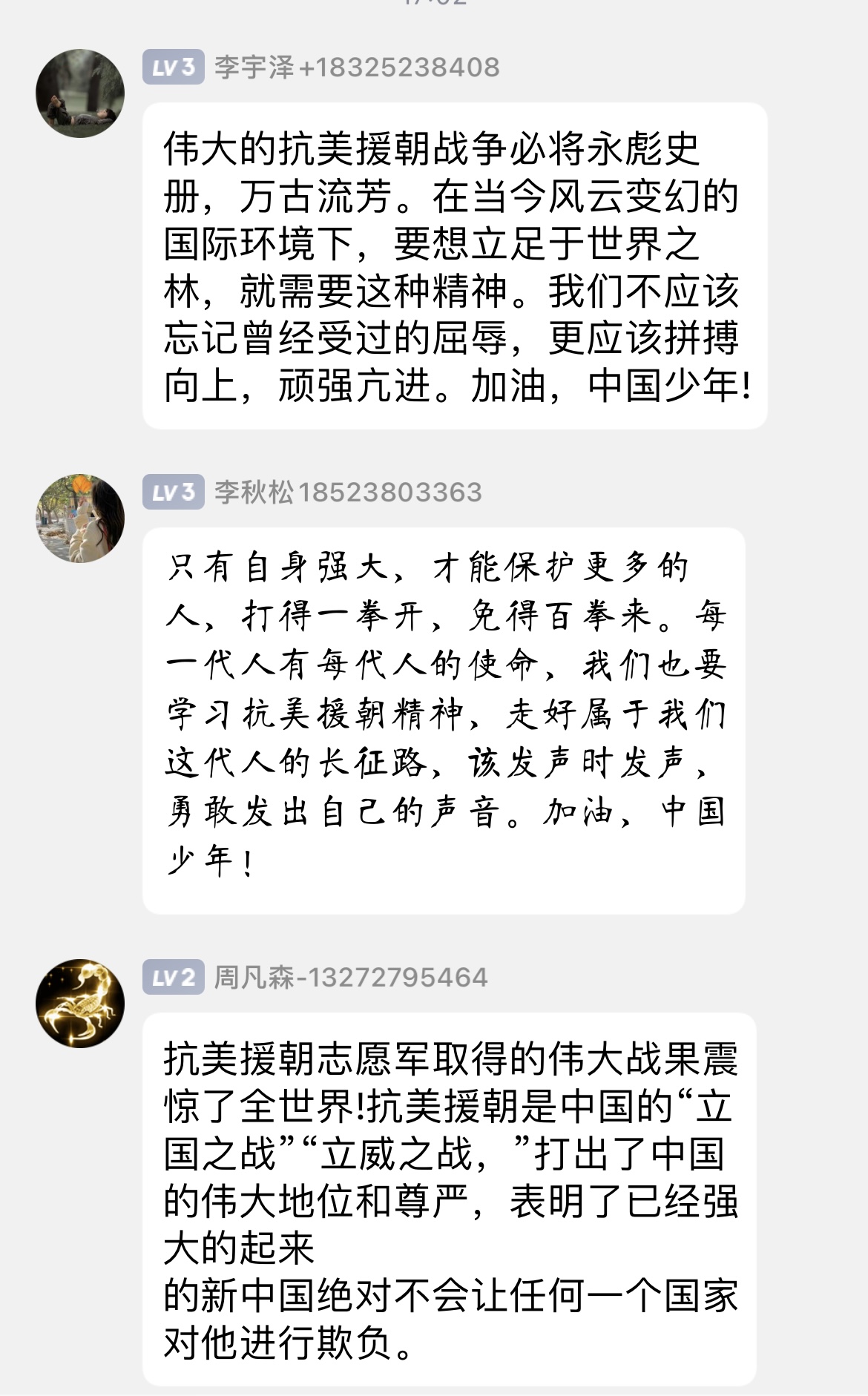 观影结束后,同学们心情久久不能平静,悲壮惨烈的战争,感动至深的情节,鲜活生动的人物,震撼人心的场景,让同学们更加真实地铭记历史、铭记先烈,极大地激发了同学们浓厚的爱国主义情怀,纷纷发表观影感言。
