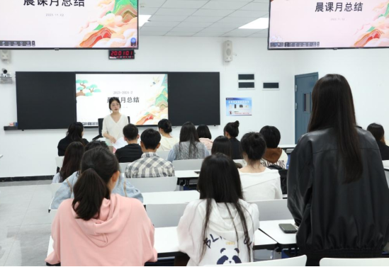 本次选拔赛由辅导员李心怡、杨颖、刘琳靖、梁甜四位老师担任评委,院级晨课助教周启明主持,14名班级月冠军参赛,全体晨课助教以及30名亲友团现场观摩学习。