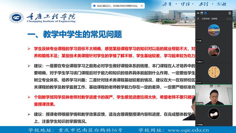 教学中的学生常见问题方面:存在授课内容不饱和,教师自身专业知识不扎实,教师师德师风不好,学生感觉不被尊重,课程学习目标不明确,教师对学情不够了解,学习进度拉太快等问题,针对以上问题都刘奇韬副教授都一一进行讲解并提出了对应的建议措施。