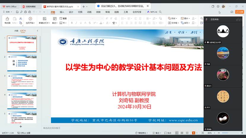 (图/文 韦峰)2024年10月30日下午,计算机与物联网学院开展了主题为“以学生为中心的教学设计基本问题及方法”的新教师培训会,由学院刘奇韬副教授主讲,学院全体新教师线上参会。