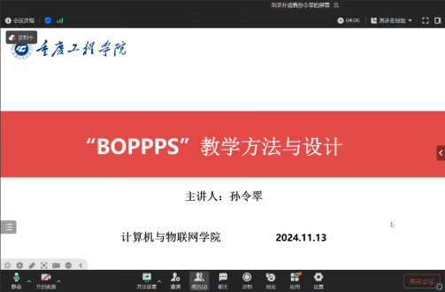 本网讯(文/图 周瑞锋)2024年11月13日晚,计算机与物联网学院开展了主题为“BOPPPS教学方法与设计”的新教师培训会,由计算机应用系主任孙令翠主讲,学院全体新教师线上参会。