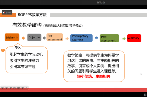 孙老师首先介绍了BOPPPS教学方法,主要包括六个环节:导入(Bridge-in)、目标(Objective)、前测(Pre-assessment)、参与式学习(Participatory Learning)、后测(Post-assessment)、总结(Summary)。随后,孙老师对每个环节的时间分配、教师应该做什么、学生应该做什么、预期教学效果等方面展开讲解,并分享了自身参加ISW教学技能工作坊时所作的BOPPPS方案设计和收获。最后,孙老师以“操作系统”课程的“进程与线程”知识点为例,进行了10分钟的BOPPPS教学演示,帮助各位新教师更好地理解BOPPP教学方法的使用。