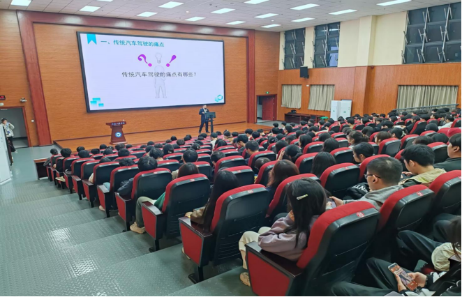 本次讲座由赛力斯智驾汽车研发部负责人张晓旭总经理主讲。大会开始,张老师通过详细的讲解,为同学们介绍了智能驾驶技术的起源、发展历程及当前的行业动态。通过精心准备的幻灯片展示和具体案例分析,张老师让同学们对智能驾驶技术有了更为全面的认识。同时,李教授还深入探讨了自动驾驶的核心技术、关键挑战以及未来的发展趋势,尤其强调了人工智能、传感器技术和物联网技术在智能驾驶中的重要作用。