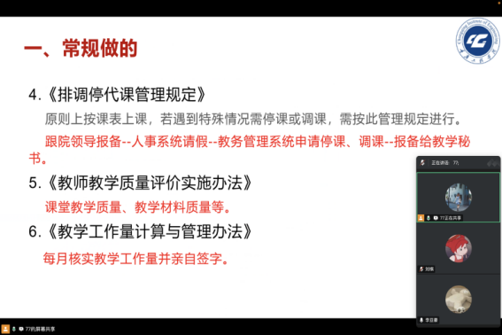 秦老师从“教学工作基本规范”和“部分教学管理制度”两个方面进行讲解,首先解释了什么是教学工作的基本规范。秦老师表示,教学是学校的中心工作,学校抓好教学常规管理,发挥教师为主导、学生为主体的作用,努力提高教学质量;并且对备课、课堂教学、辅导答疑、作业批改、调/停课等基本环节进行了说明。秦老师随后介绍了学校的相关制度和细则,并从教师常规做、鼓励做以及不能做三个方面来讲解,鼓励新教师参与各项建设和竞赛,同时要避免不经意间违反学校规定、造成教学事故。
