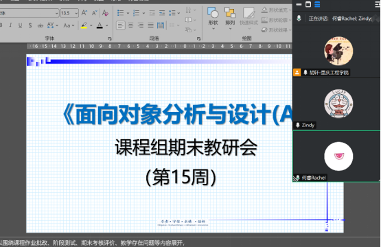 本网讯(文/图 胡轩)期末将至,为了做好期末安排,更好的完成本期教学工作,6月4日,《面向对象分析与设计(A)》课程组在线上召开了本次课程组教研活动,参会人员包括课程组胡轩、曾迪、何睿三位老师。