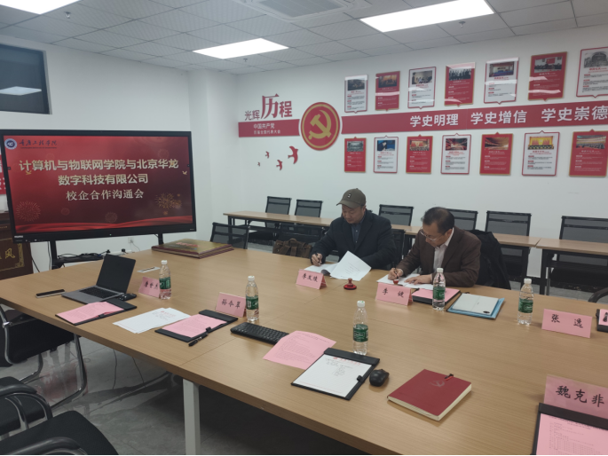 北京华龙数字科技有限公司副总经理李健、技术顾问张逸、重庆工程学院计算机与物联网学院院长李发陵、院长助理孙令翠、就业科科长魏克非及相关专业教师代表共同出席了本次会议。
