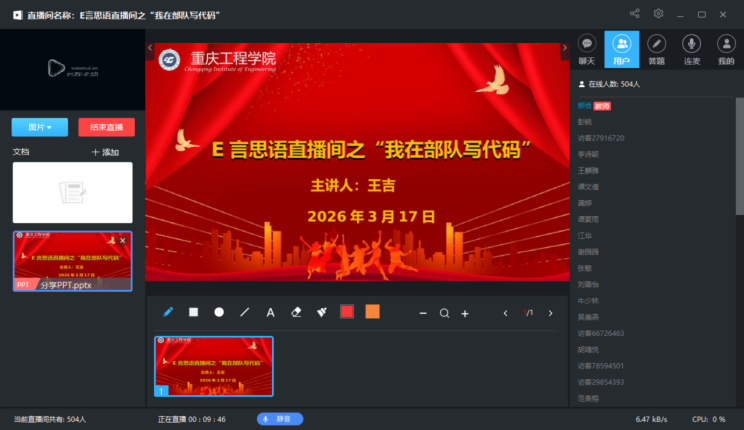 本次分享会线下参与20余名同学,线上通过“E言思语”直播间吸引两校区500余名学弟学妹同步观看。王吉校友结合自身军旅生涯与专业实践经历,讲述了在部队岗位上运用代码技术履职尽责、逐梦前行的成长故事,为在场及线上的同学们树立了青春榜样,激发了同学们立足专业、报效祖国的热情与担当。