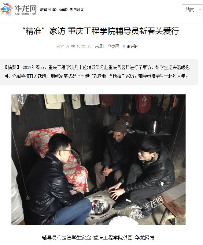 本网讯(党委宣传部)【摘要】 2017年春节,重庆工程学院几十位辅导员分赴重庆各区县进行了家访,给学生送去温暖慰问、介绍学校有关政策、调研家庭状况……他们就是要 “精准”家访,辅导员陪学生一起过大年。华龙网对本次关爱行动的大力报道,包括重庆时报、网易、今日头条、南昌新闻网、hao123等10多家门户网站进行转载。