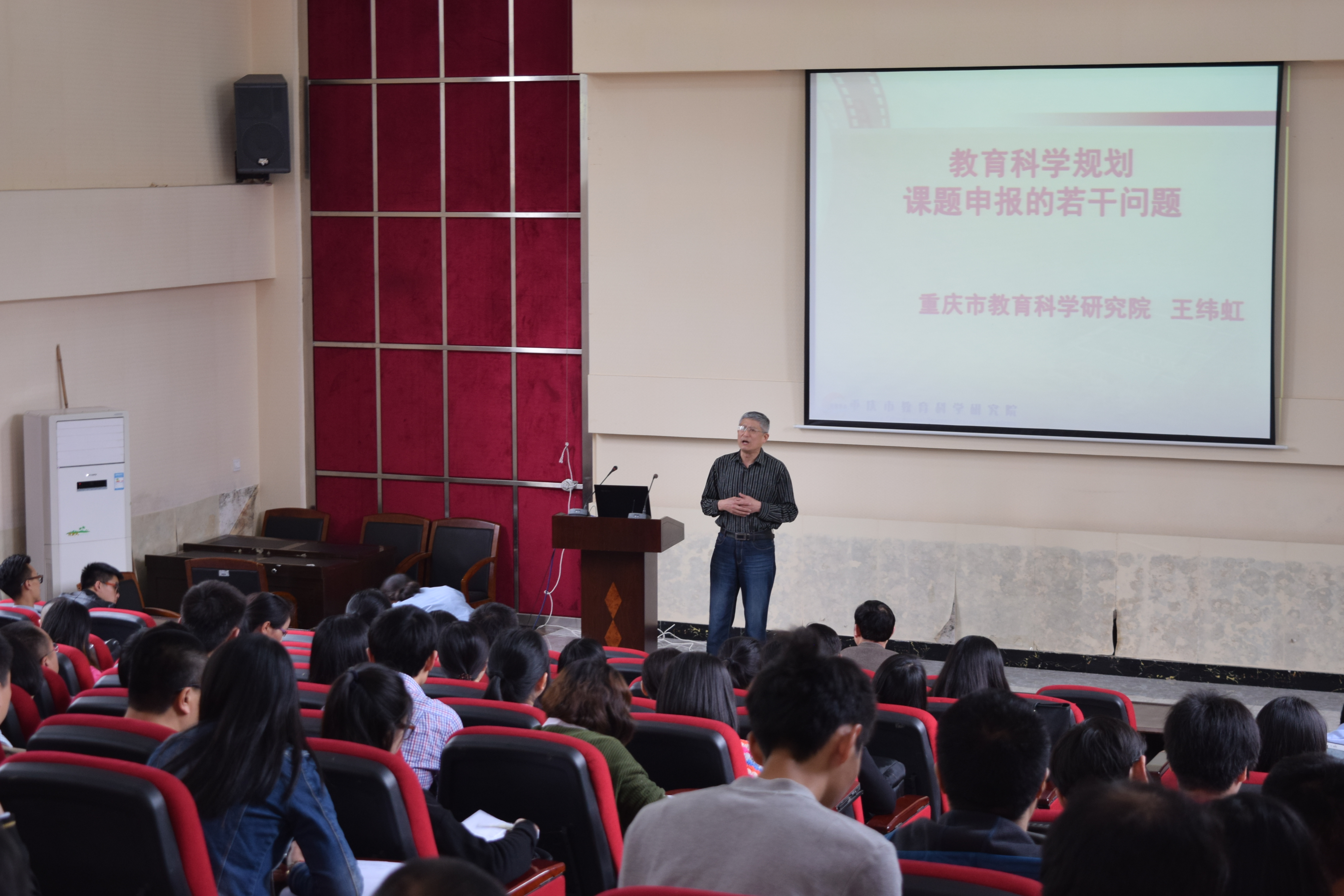 本网讯(科技处 周亮)4月21日下午,我校在行政楼报告厅举行教育科研专题培训。本次培训由人事处与科技处共同组织,邀请了重庆市教育科学研究院副院长、市教育科学规划办常务副主任、重庆市学术技术带头人、重庆市人民政府兼职督学王纬虹研究员讲授《教育科学规划课题申报的若干问题》。