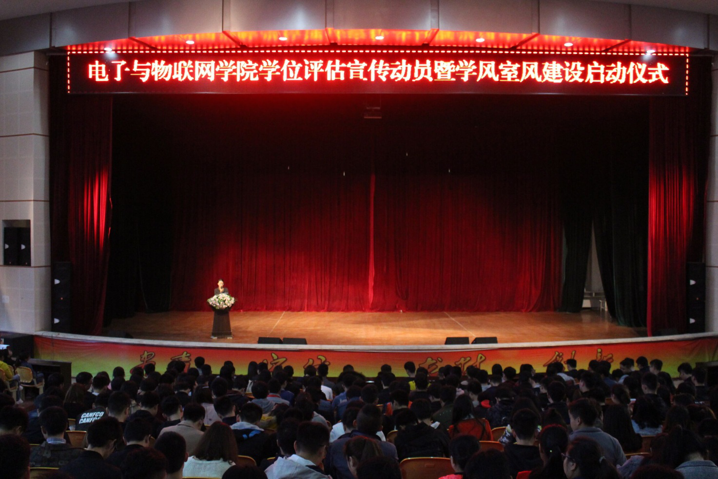 本网讯(文/申文芳 大学生记者团 图/申文芳 ) 为深入推进学位评估工作,进一步纯洁班级学风室风,3月20日晚,电子与物联网学院在学术报告厅,召开学位评估宣传动员暨学风室风建设启动会。