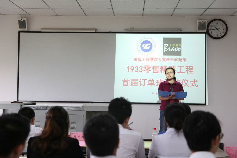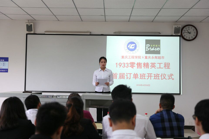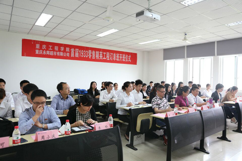 管理学院执行院长简玉刚、永辉超市渝南区区总孙文晞等学院和公司领导,首届订单班全体同学参加开班仪式。