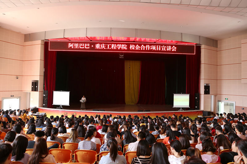阿里巴巴客户体验事业群高级专家裘立锋、校企合作全国运营负责人章伟杰、校企重庆负责人王娜、校企基地运营负责人蒋玉菡,管理学院执行院长简玉刚、党总支书记邹均等学院领导,教师代表及2016级市场营销、电子商务专业同学,共700多人参加宣讲会。